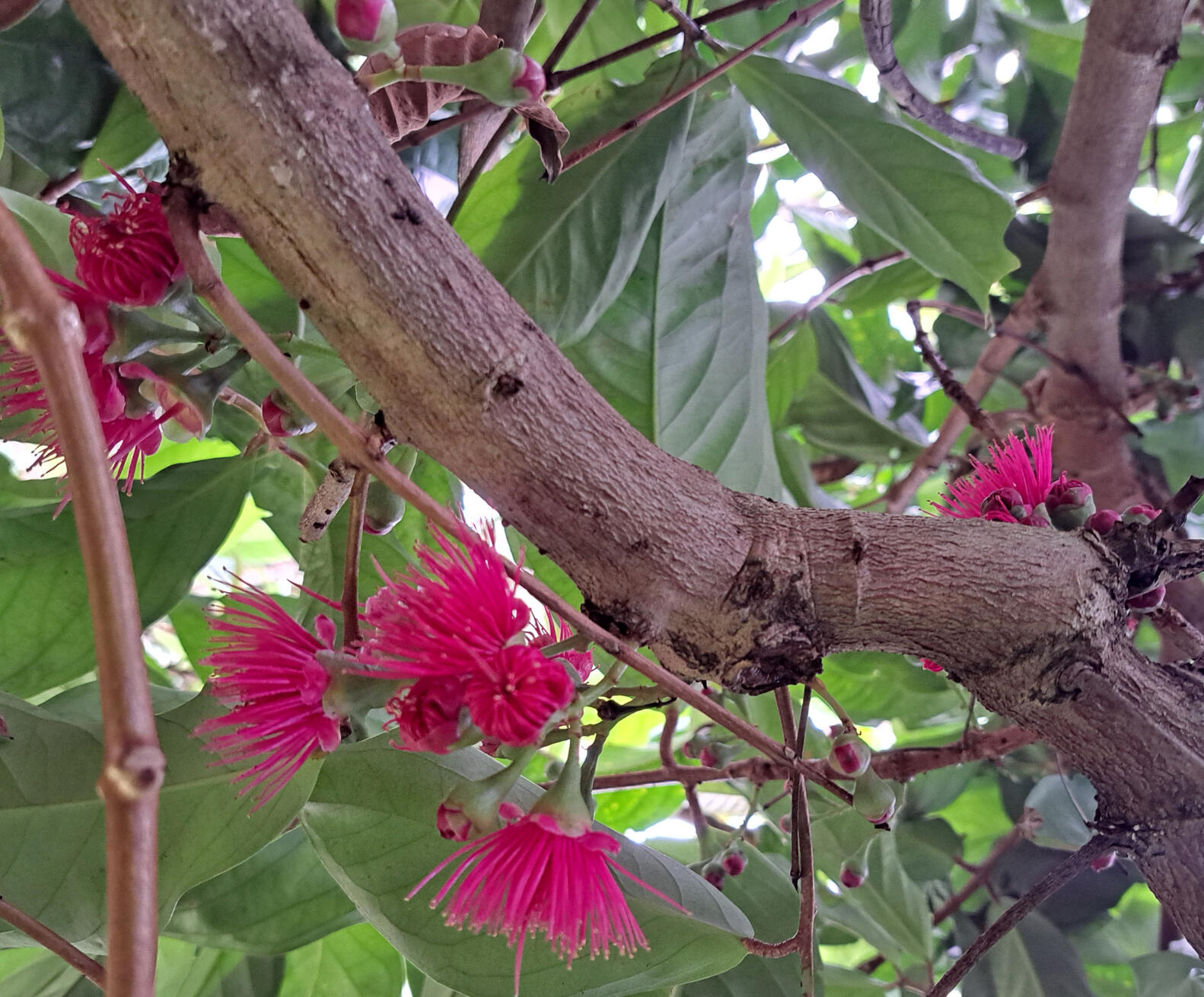 Flavor: Crisp, watery flesh with a subtle sweet flavor and hints of rose apple.Size: Medium to large tree, reaching 20-50 feet tall with a dense, rounded crown.Flowers: Stunning bright red to hot pink clusters that emerge directly from the trunk and branches.Fruit: Bell-shaped, 2-5 inches long, ranging from light green to deep red or purple-red when ripe.Cold Tolerance: Tropical, thrives in USDA zones 10a-12b (perfect for most Hawaiian elevations).Growing: Requires full sun (6-8 hours daily), well-draining soil, and protection from strong winds. Can produce fruit up to three times per year in ideal conditions.